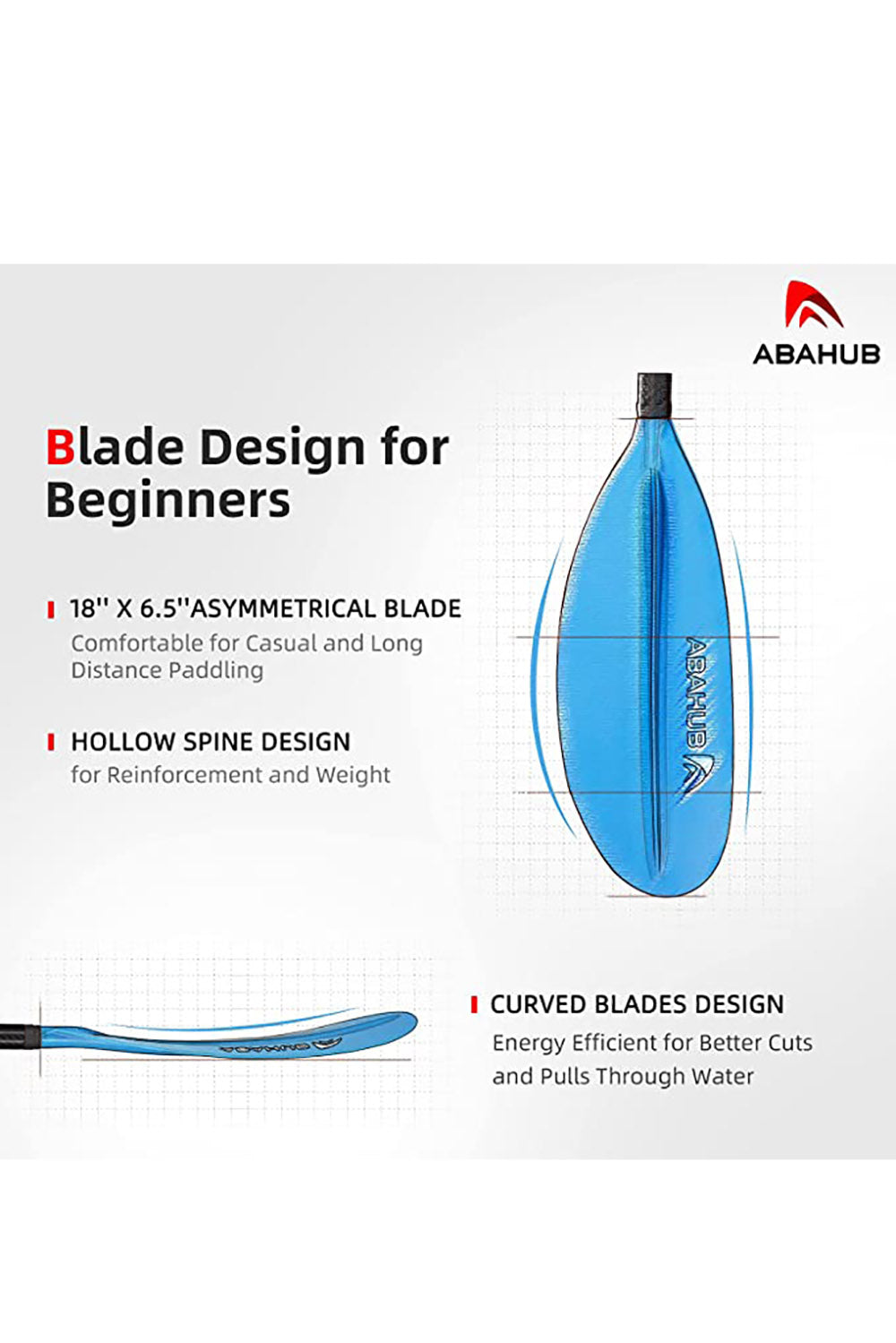 - ENERGY EFFICIENT BLADE DESIGN: With 18'' x 6.5''Asymmetrical blades, this paddle is comfortable and energy-saving, both for casual and long-distance paddling. The blades are feathered with a hollow spine for reinforcement and less weight. All these add up to better cuts and pulls through the water.